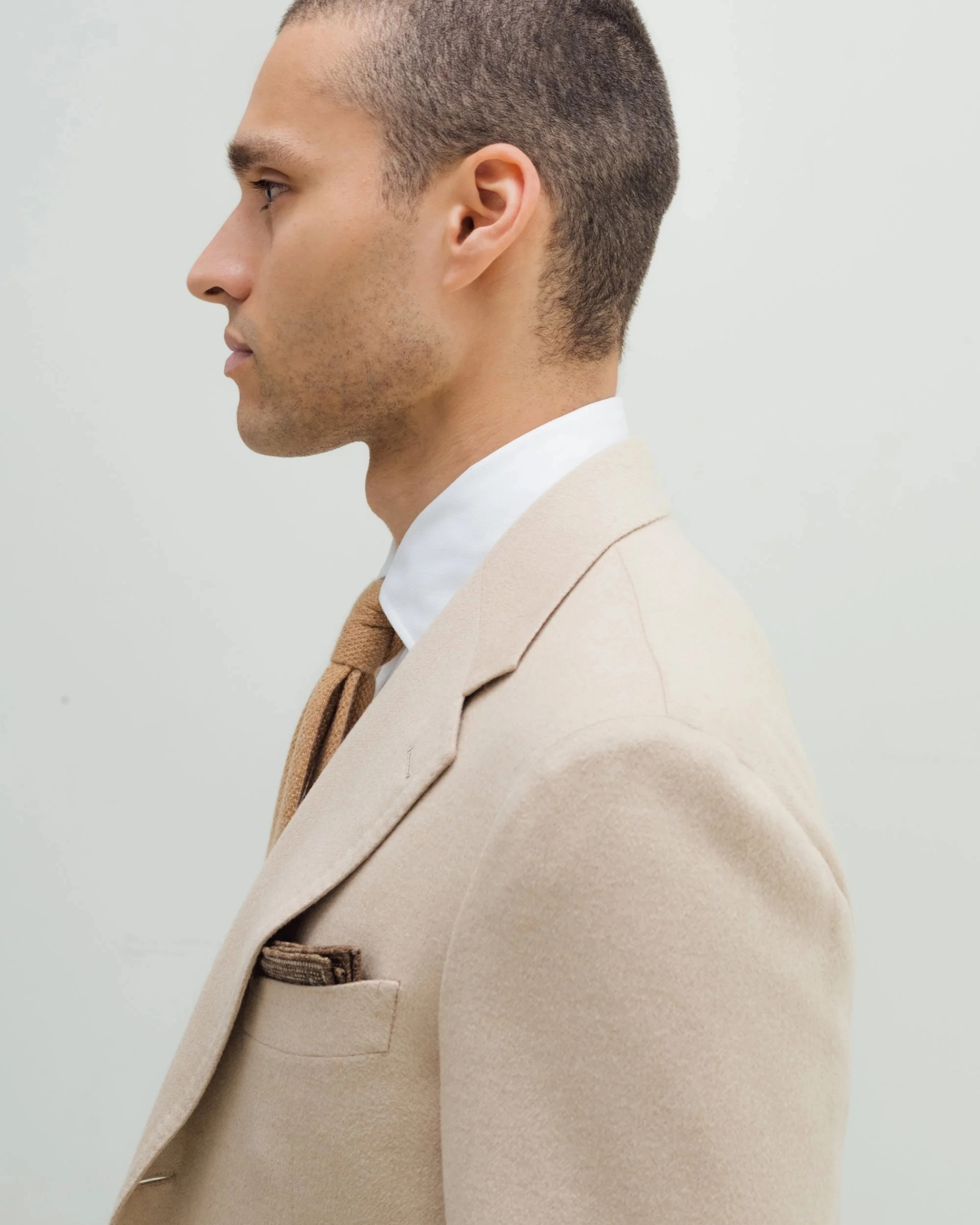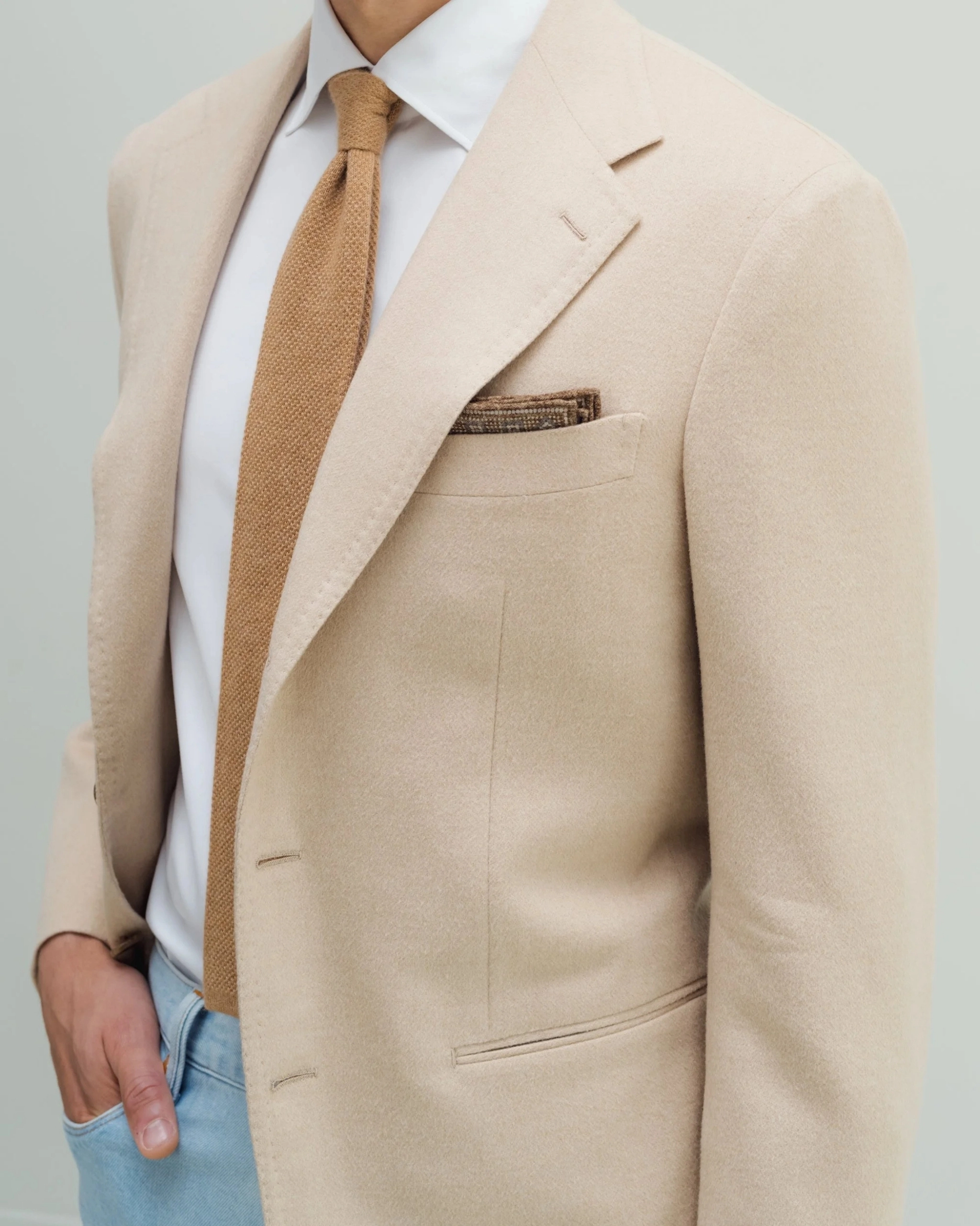 This Beige Luxury Jacket is crafted from an exclusive baby camel hair by the italian luxury brand, Loro Piana. This jacket riffs on classic tailoring with a clean notch lapel and a casual, streamlined silhouette. Now also in round shape bottom offering a modern blend of structure and ease.