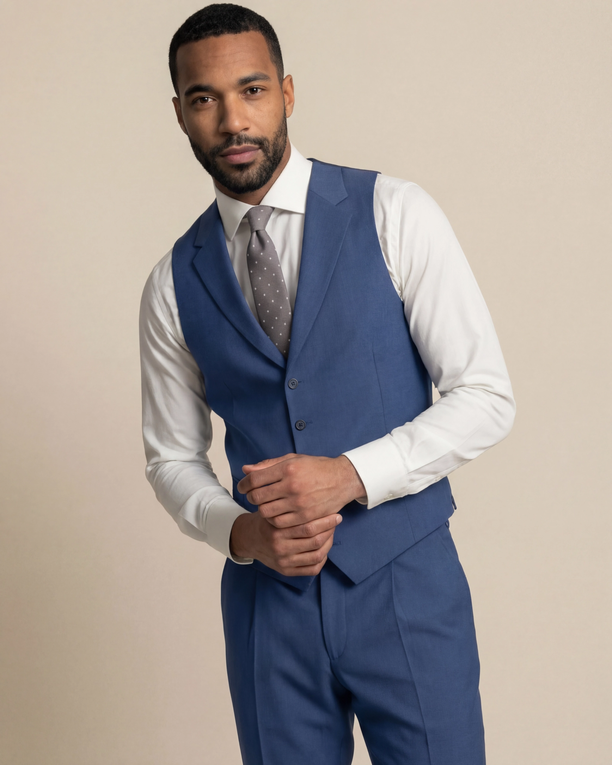 The Blue Waistcoat is a refined garment crafted from a wool and mohair blend that creates a lively texture and structured drape. This waistcoat pairs perfectly with tonal suits or contrasting pieces for a polished, elevated look. The luxurious fabric ensures comfort and durability while maintaining a crisp silhouette. Elegant tailoring and thoughtful design make it a standout choice for formal or semi-formal occasions.