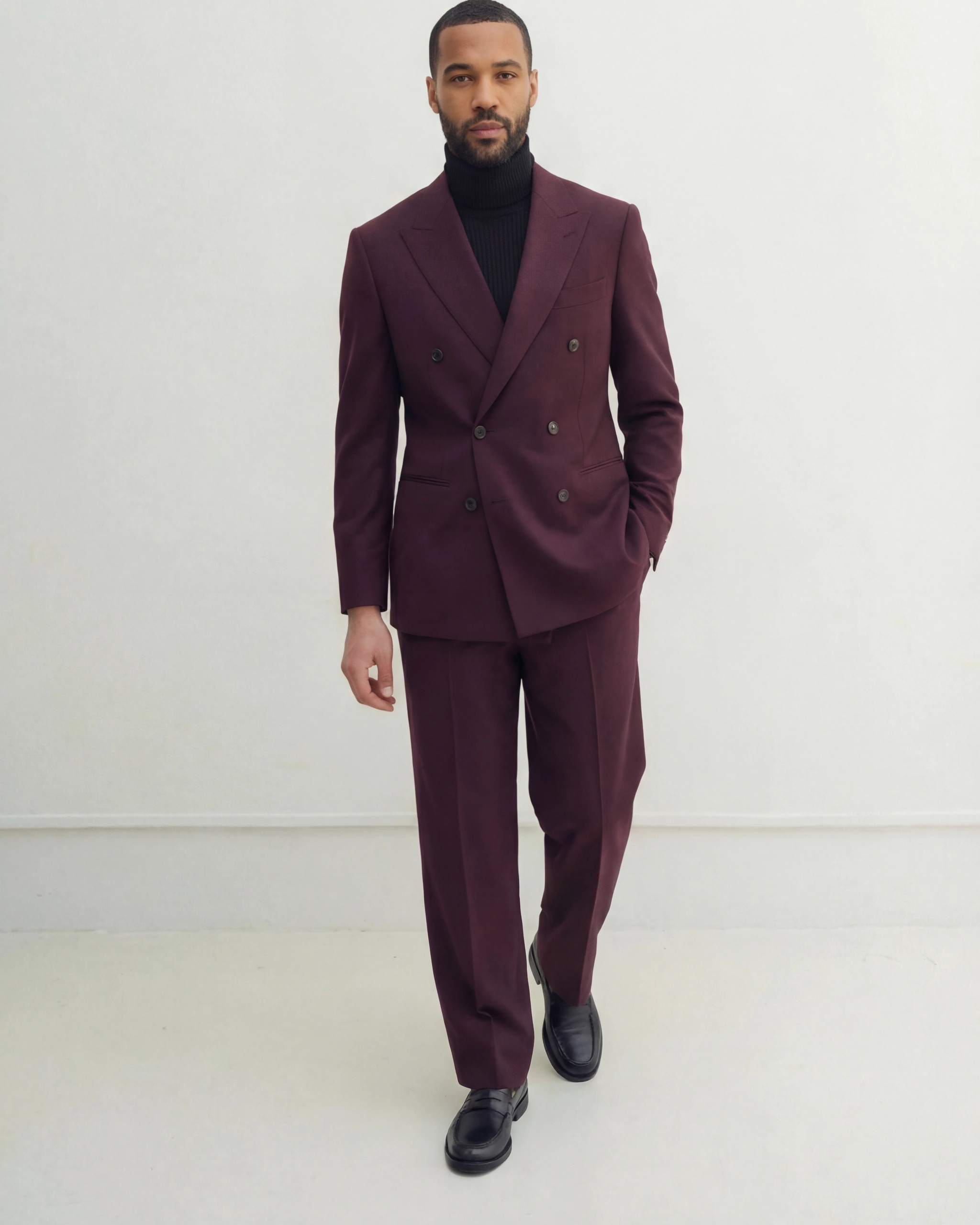 Bordeaux Double Breasted Jacket is crafted from Super 120 virgin wool with stretch, woven in the House of Vinterberg Wool Collection. The refined bordeaux tone and double breasted construction create a strong yet elegant silhouette suited for both formal occasions and modern business wear. Natural breathability and a smooth hand feel ensure comfort throughout the day.