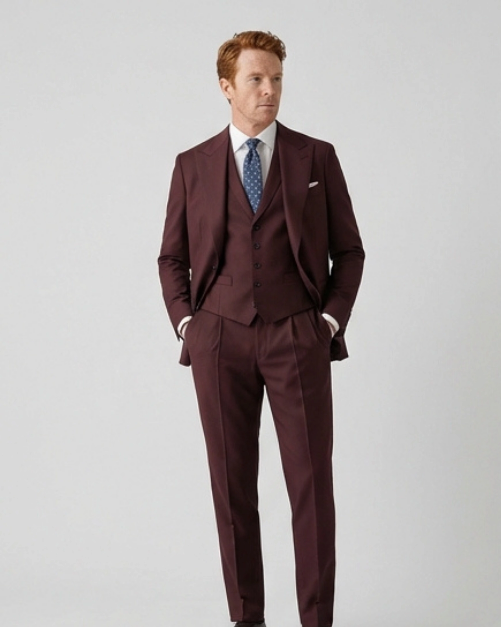 Our burgundy three-piece suit is made for the man who values discreet luxury, quality, and modern tailoring. A timeless set that combines traditional craftsmanship with contemporary flexibility, offering an elegant choice for any wardrobe.