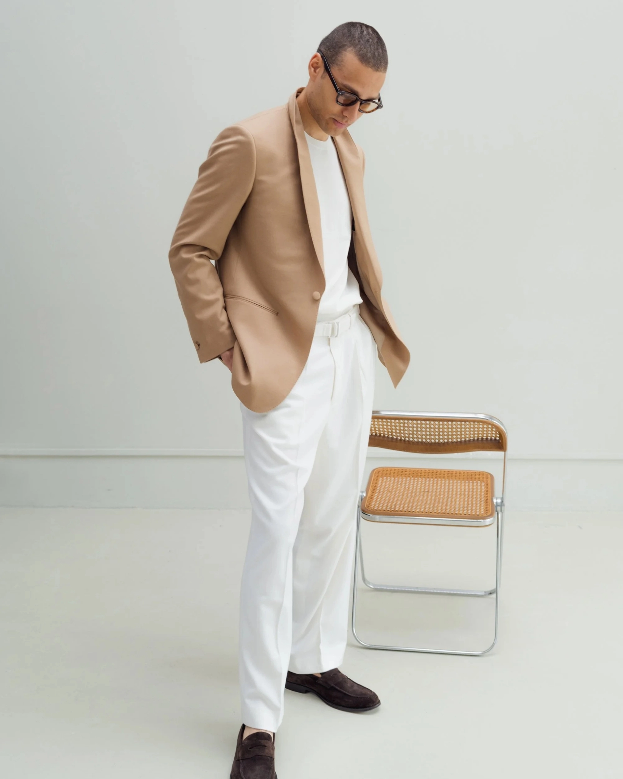 Denne beige jakke med sjalrevers er fremstillet i S120-uld og giver et raffineret, men afslappet look. Det åndbare stof giver en let struktur med naturlig tekstur, hvilket gør den ideel til forårs- og sommerbrug. Dens varme beige farve og rene silhuet sikrer alsidighed ved både formelle og smarte, afslappede lejligheder.