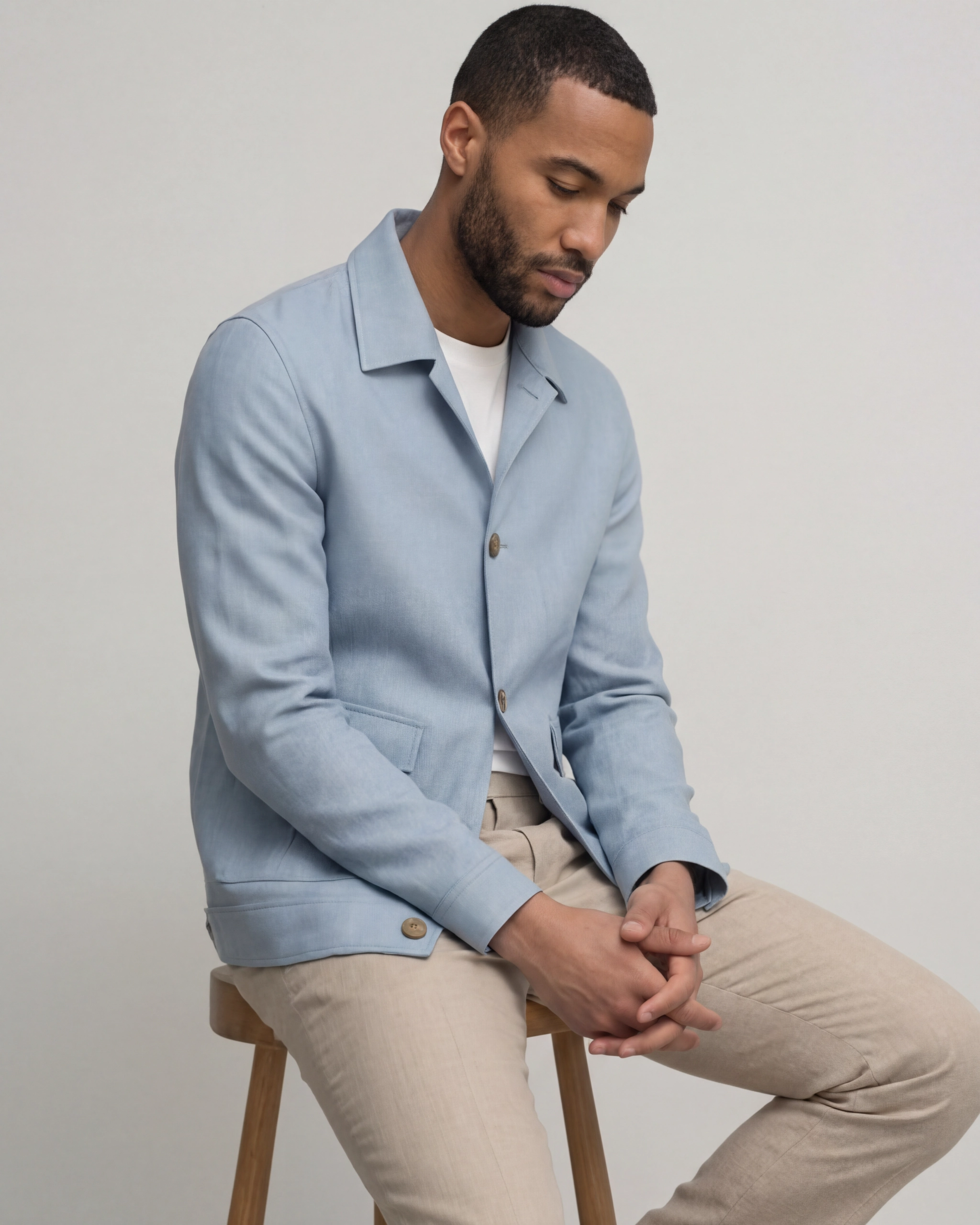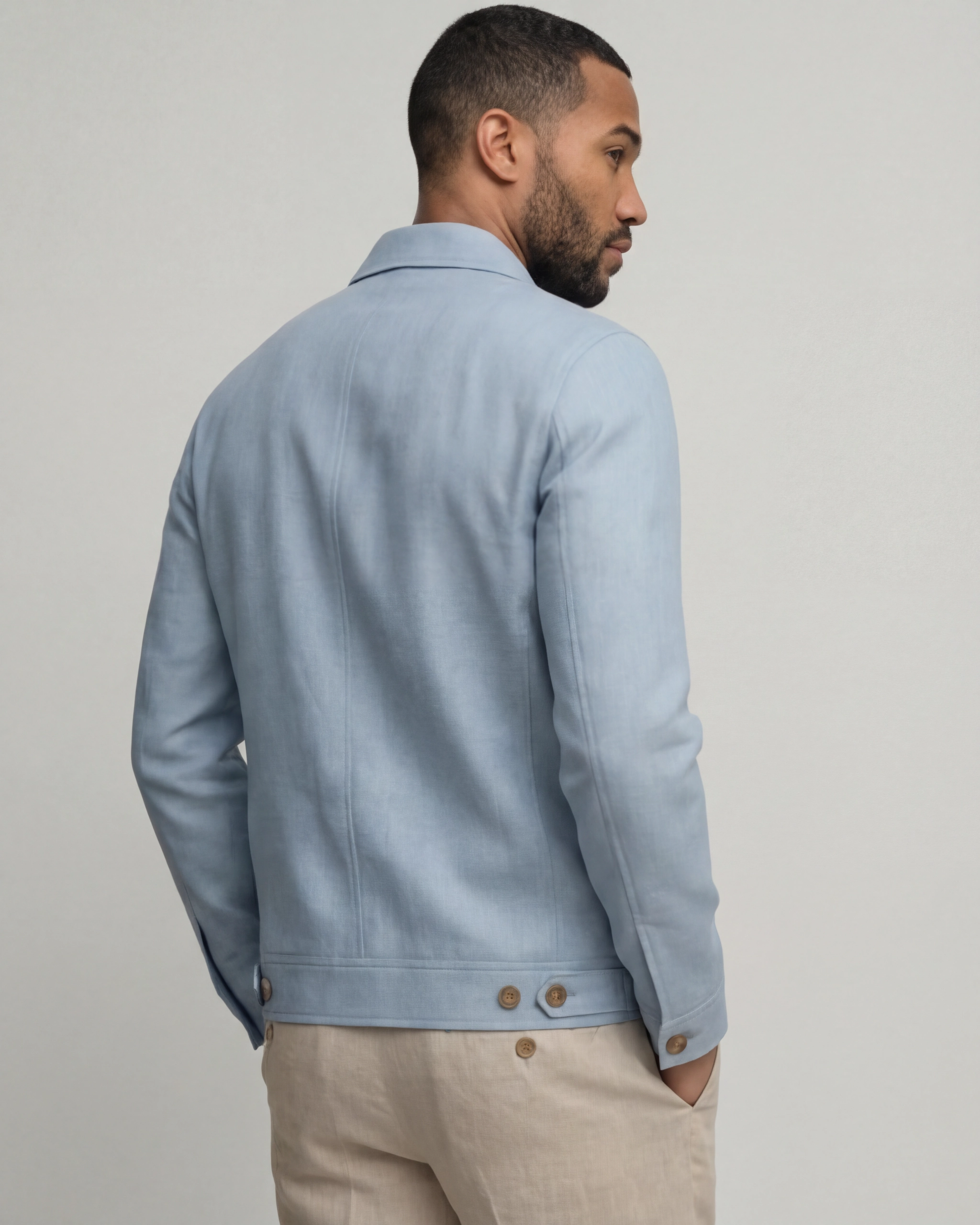 Lyseblå hørblouson til alsidig lag-på-lag-brug.