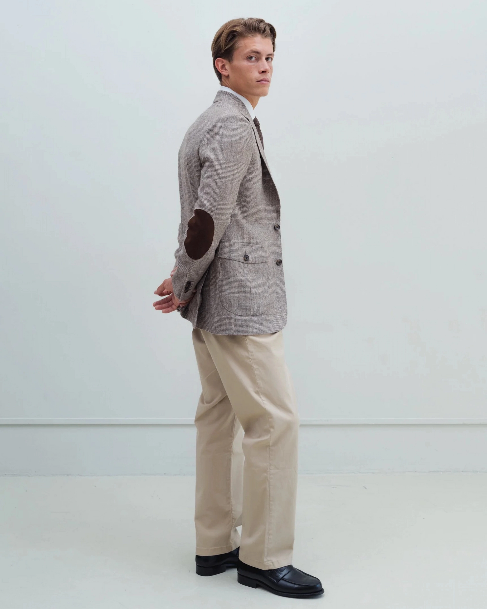 En raffineret sportsjakke i varme brune toner med ternet mønster. Det ustrukturerede snit giver en afslappet elegance, der brolagger mellem formel og casual.
