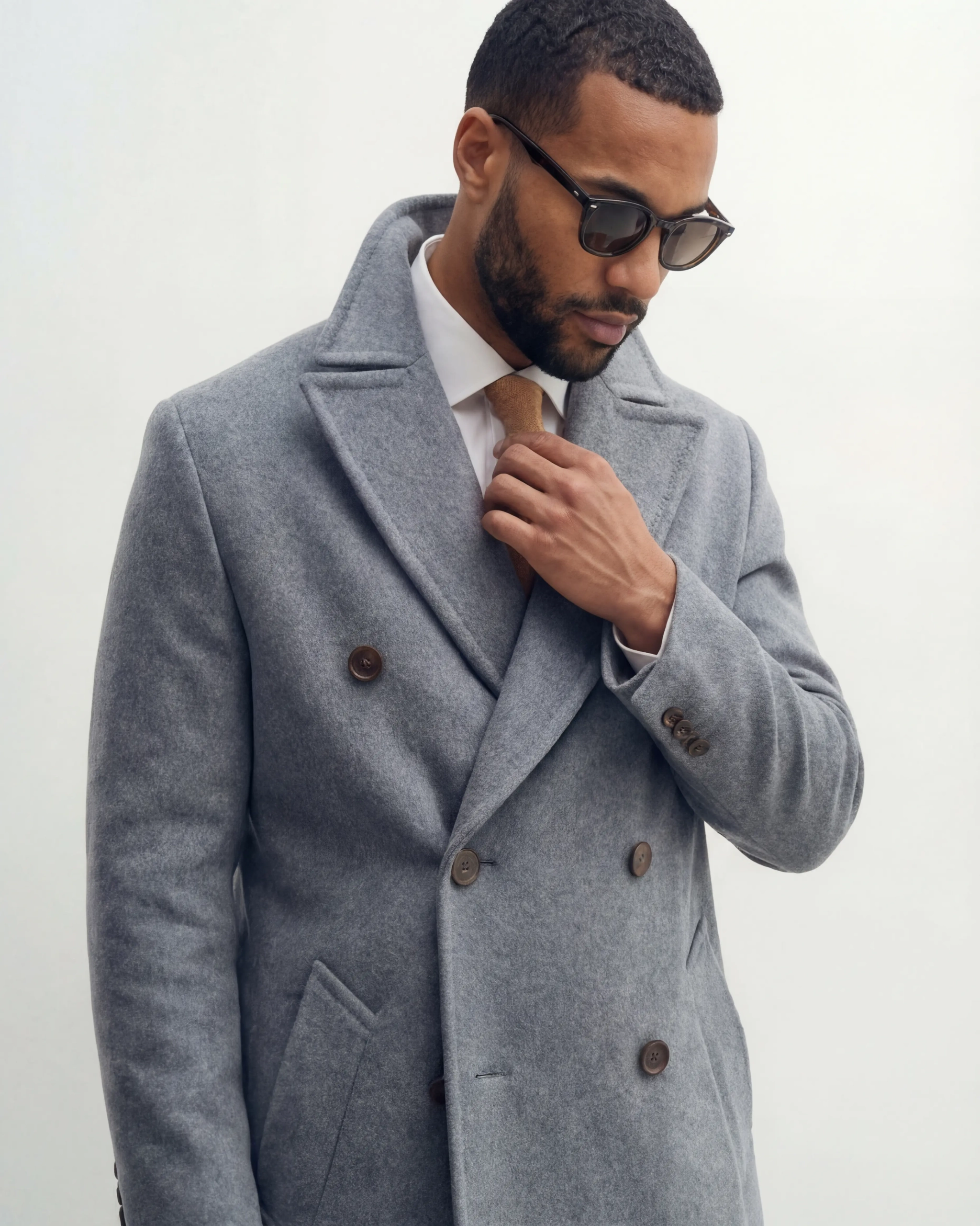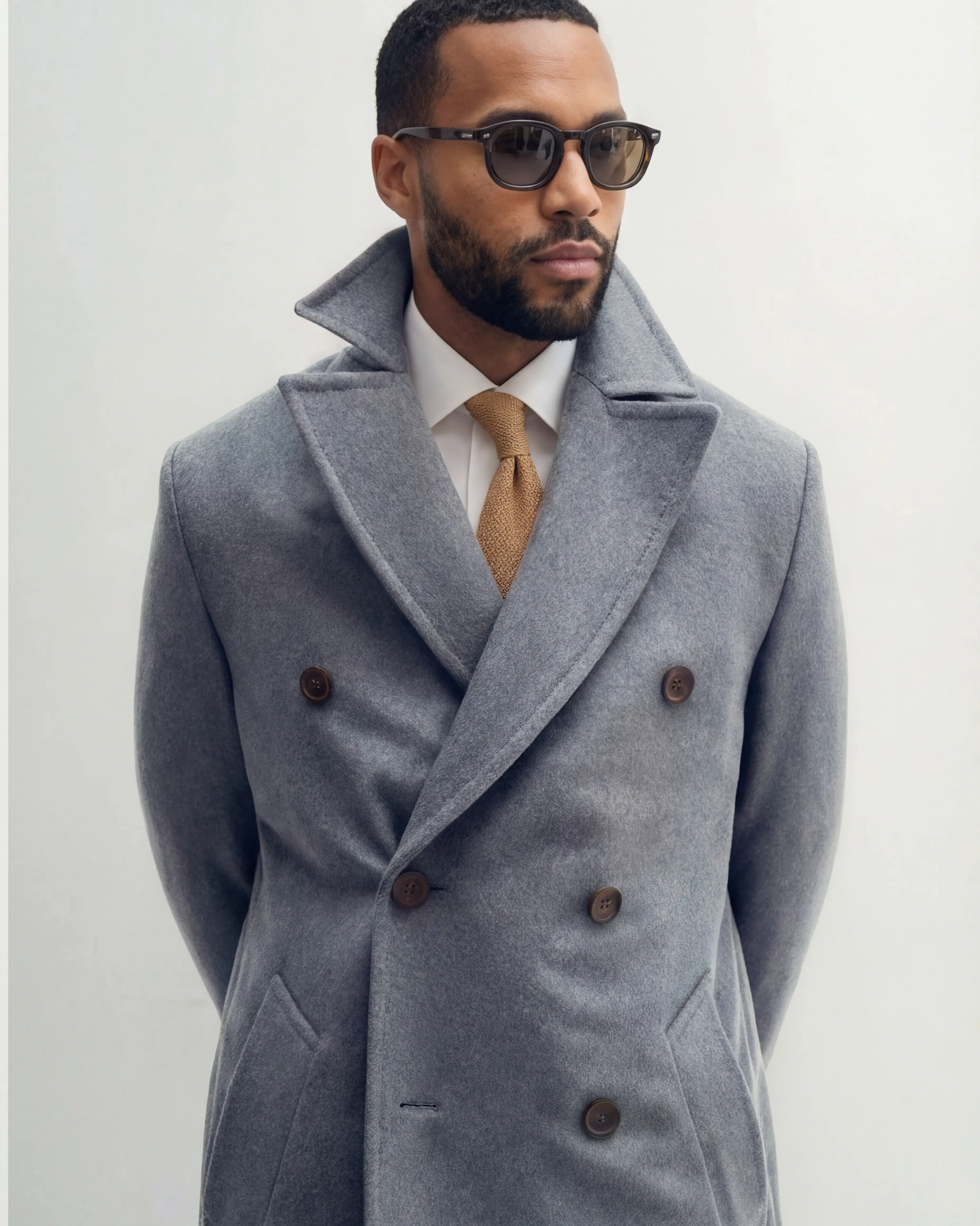 Vores dobbeltradet grå frakke er en moderne fortolkning af klassisk skrædderkunst med sin strukturerede silhuet og alsidige tone. Denne grå overfrakke er designet til at løfte både formelle og smarte casual looks gennem de koldere årstider.