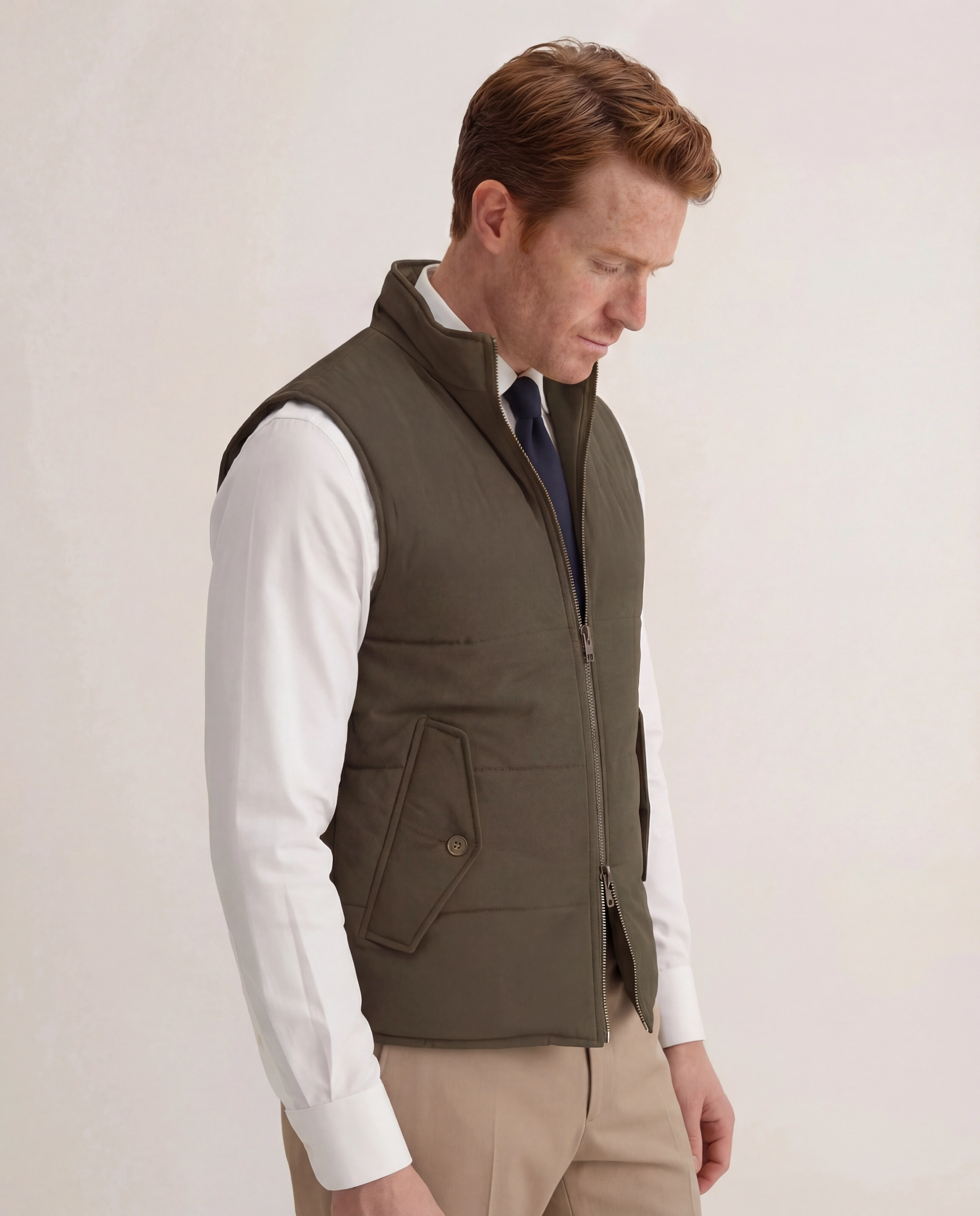 Stilfuld olivenfarvet gilet med vindtæt og vandafvisende finish.