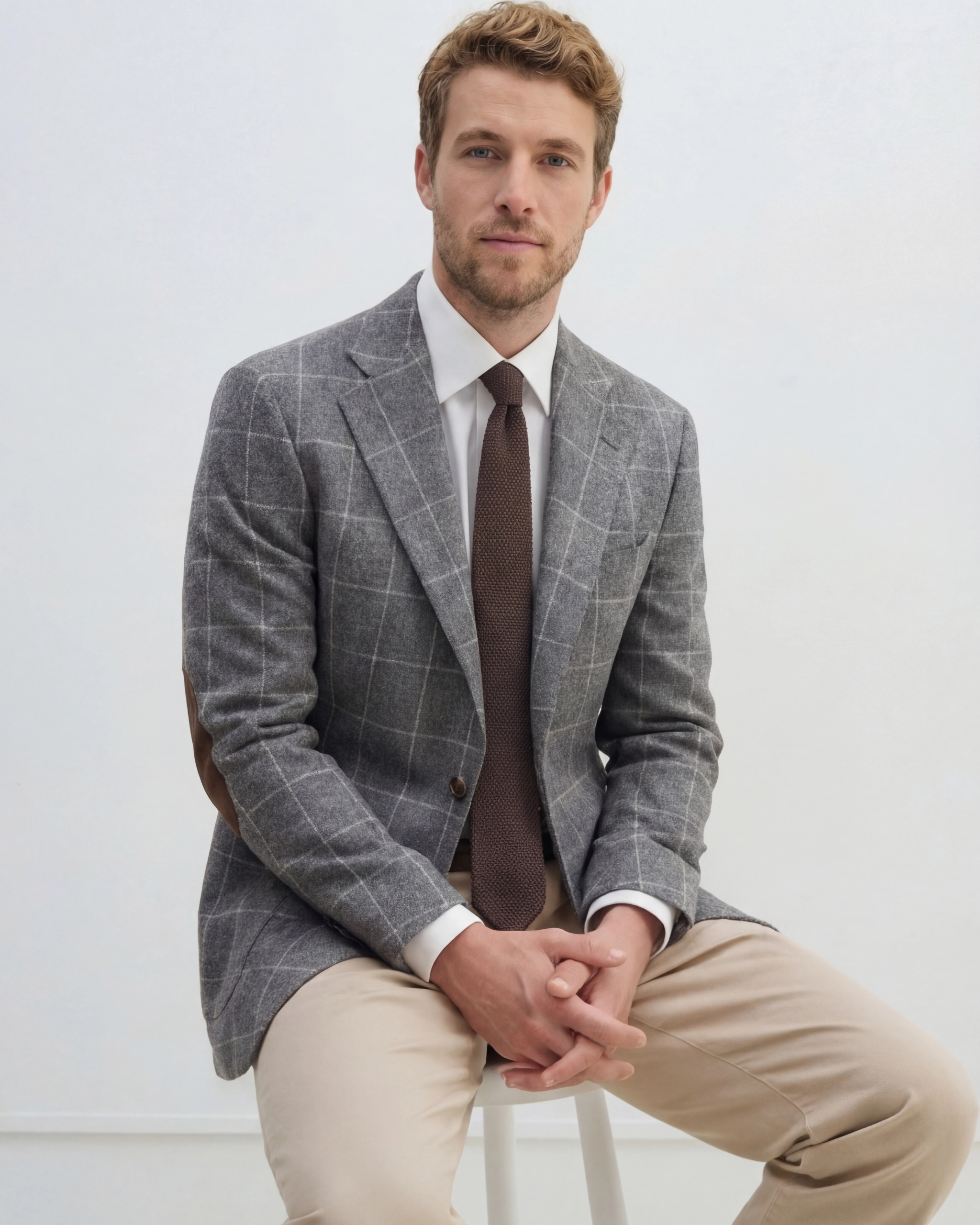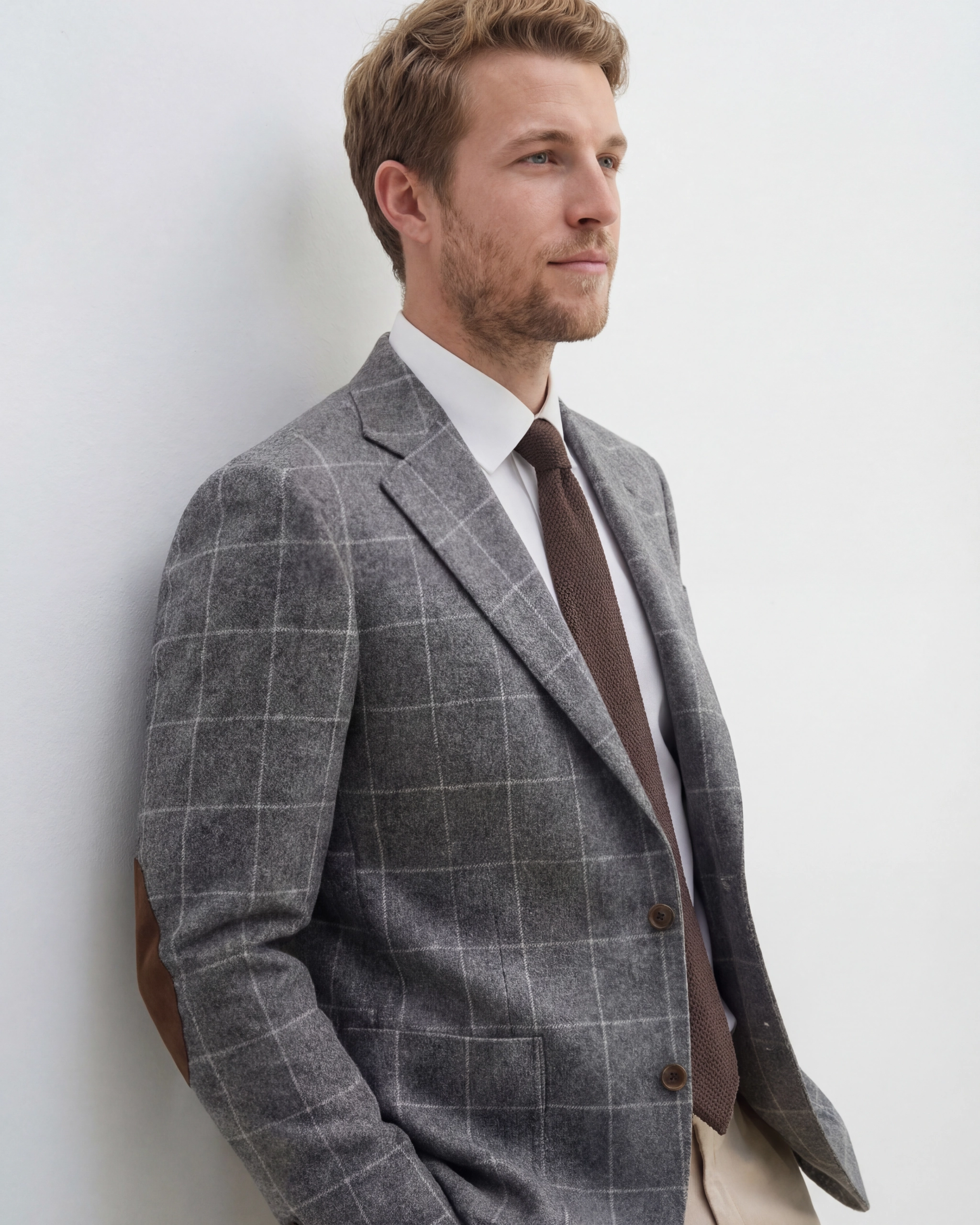 • Par din Grå windowpane S110 uld sportsjakke med en hvid eller pastelfarvet skjorte og skræddersyede bukser til forretningssammenhænge