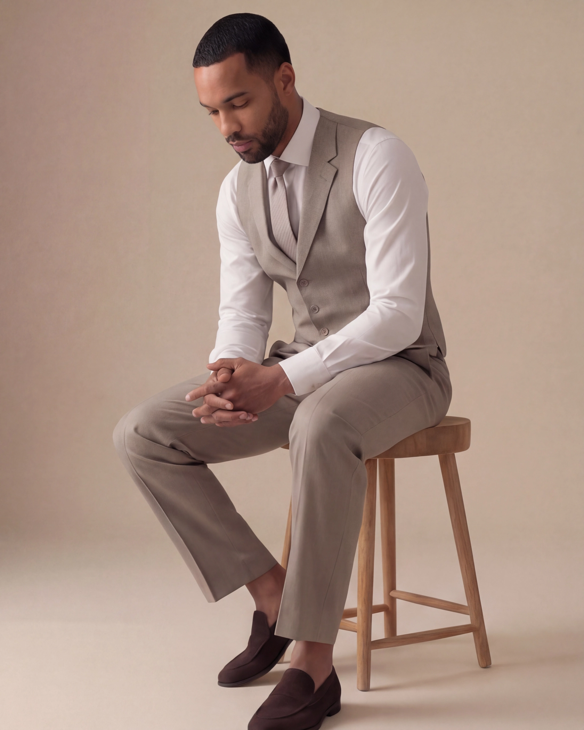 Denne lysbeige vest er et elegant alternativ til traditionelle grå og marineblå farver. Den er fremstillet af Super 110s uld og har en ren finish og et let fald, der giver varme til både tonale outfits og mørkere kombinationer. Designet til dem, der sætter pris på klassisk stil med et lettere touch.