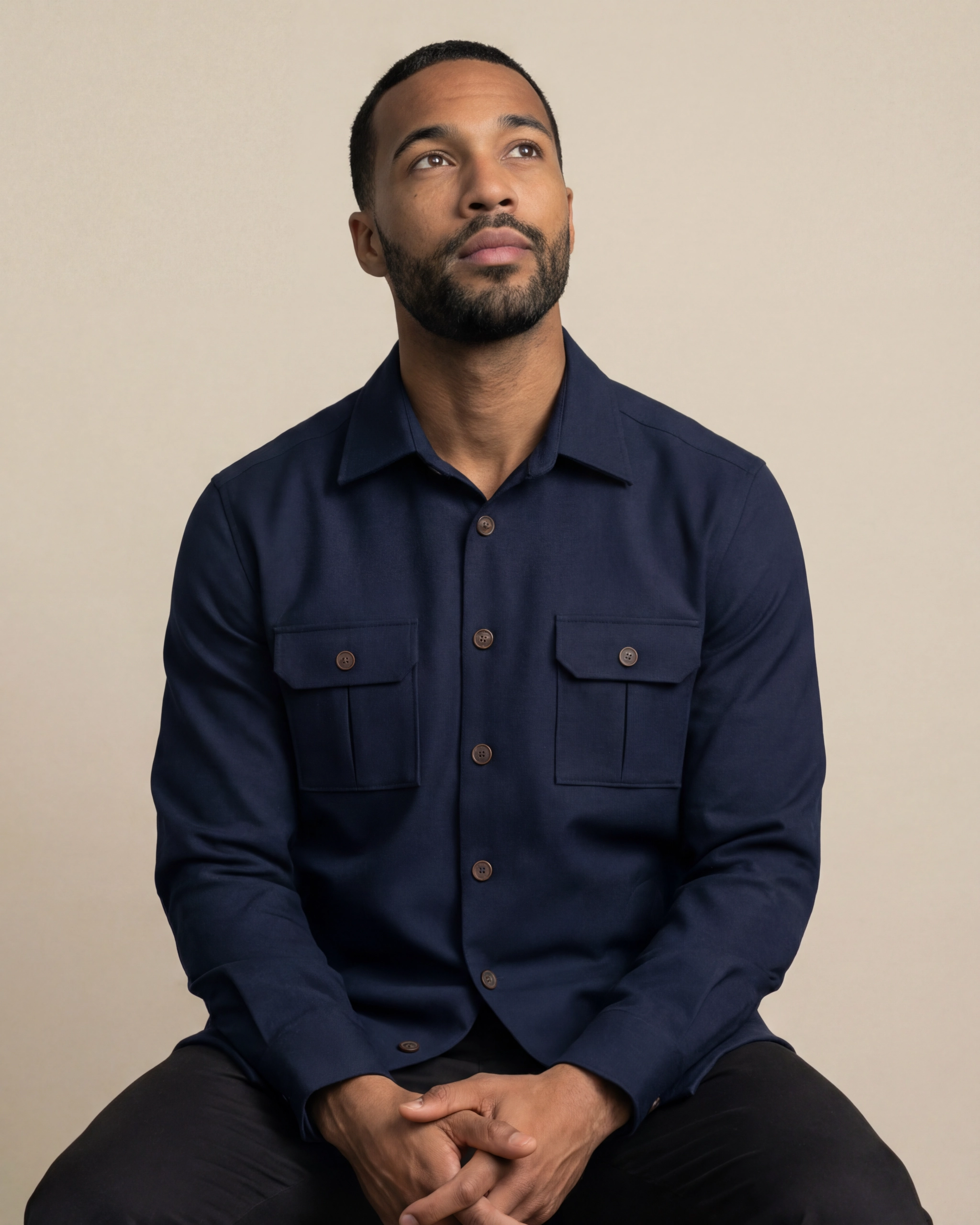 Denne marineblå shirt jacket kombinerer blød bomuld med en struktureret og velafbalanceret pasform, der gør den til et alsidigt valg i den moderne garderobe. Materialet føles behageligt og naturligt mod kroppen, samtidig med at det bevarer en skarp form, som giver et rent og poleret udtryk gennem hele dagen.