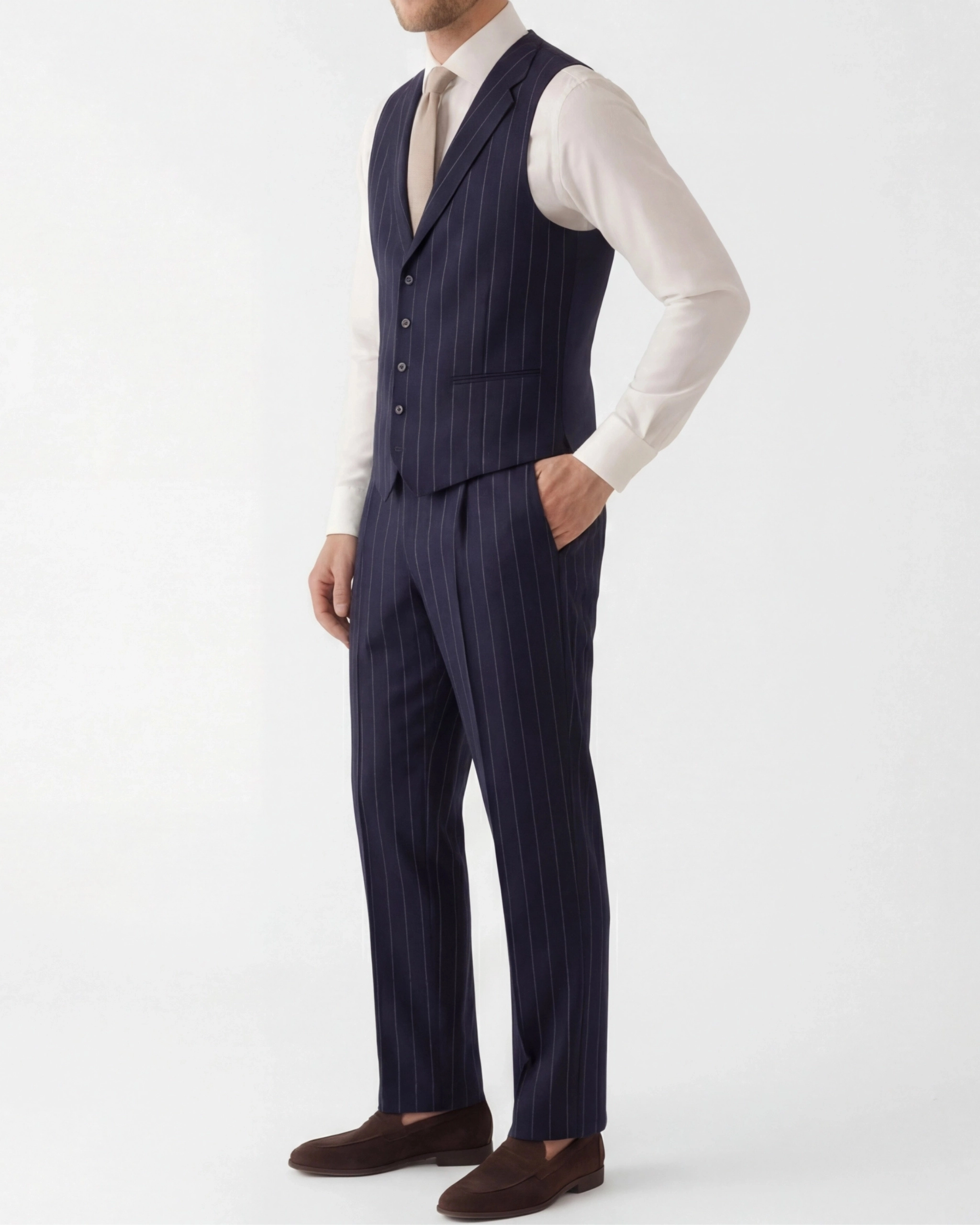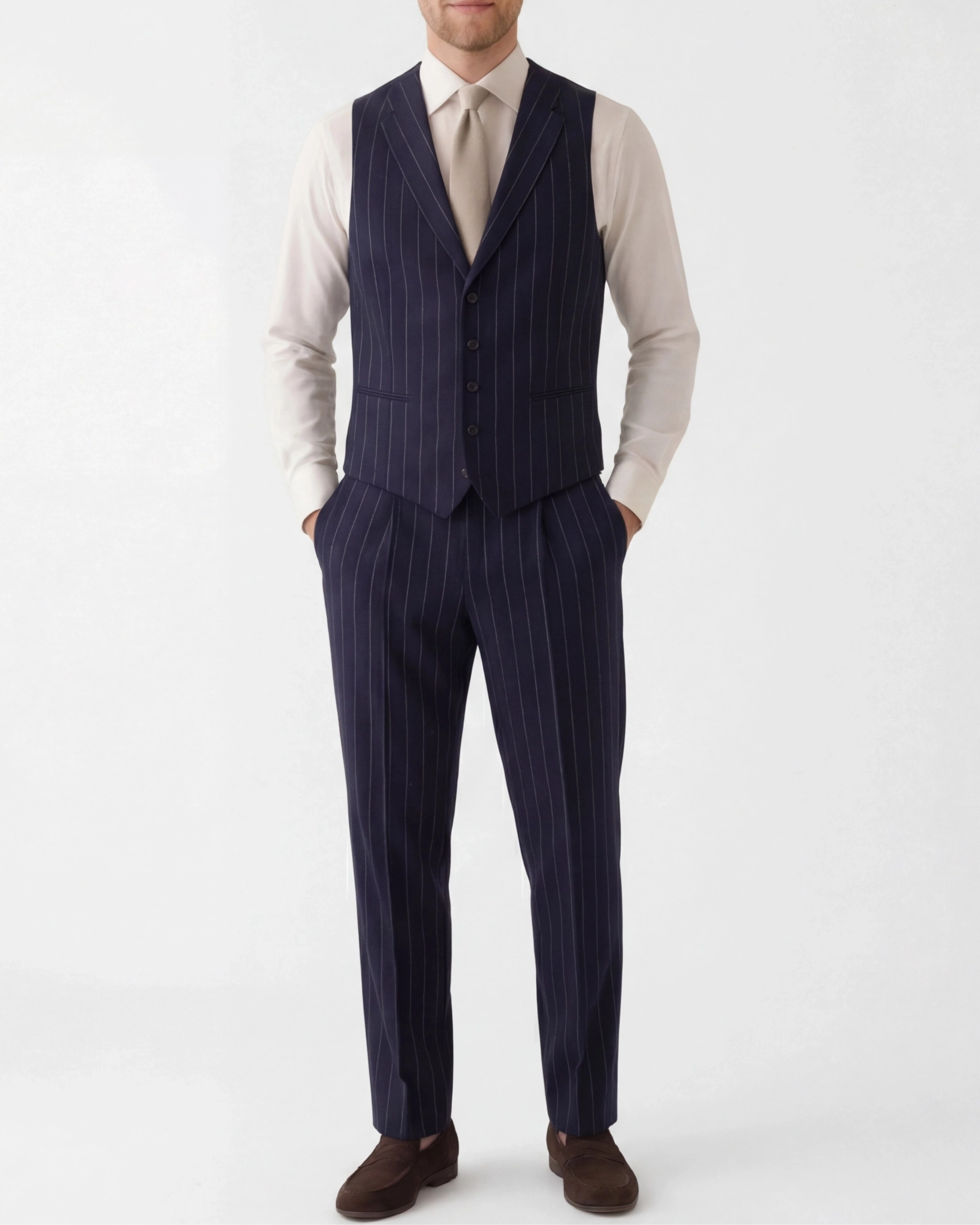 Navy nålestribet vest er skræddersyet af Super 130s uld og giver et raffineret og elegant look. Vesten har diskrete striber, der fremhæver klassisk skrædderkunst, men forbliver underspillet. Den er perfekt til både formelle lejligheder og sofistikeret hverdagsbrug og giver ethvert outfit et strejf af særpræg. Designet prioriterer komfort og holdbarhed, hvilket sikrer, at denne Super 130s uldvest forbliver en fast bestanddel af garderoben.
