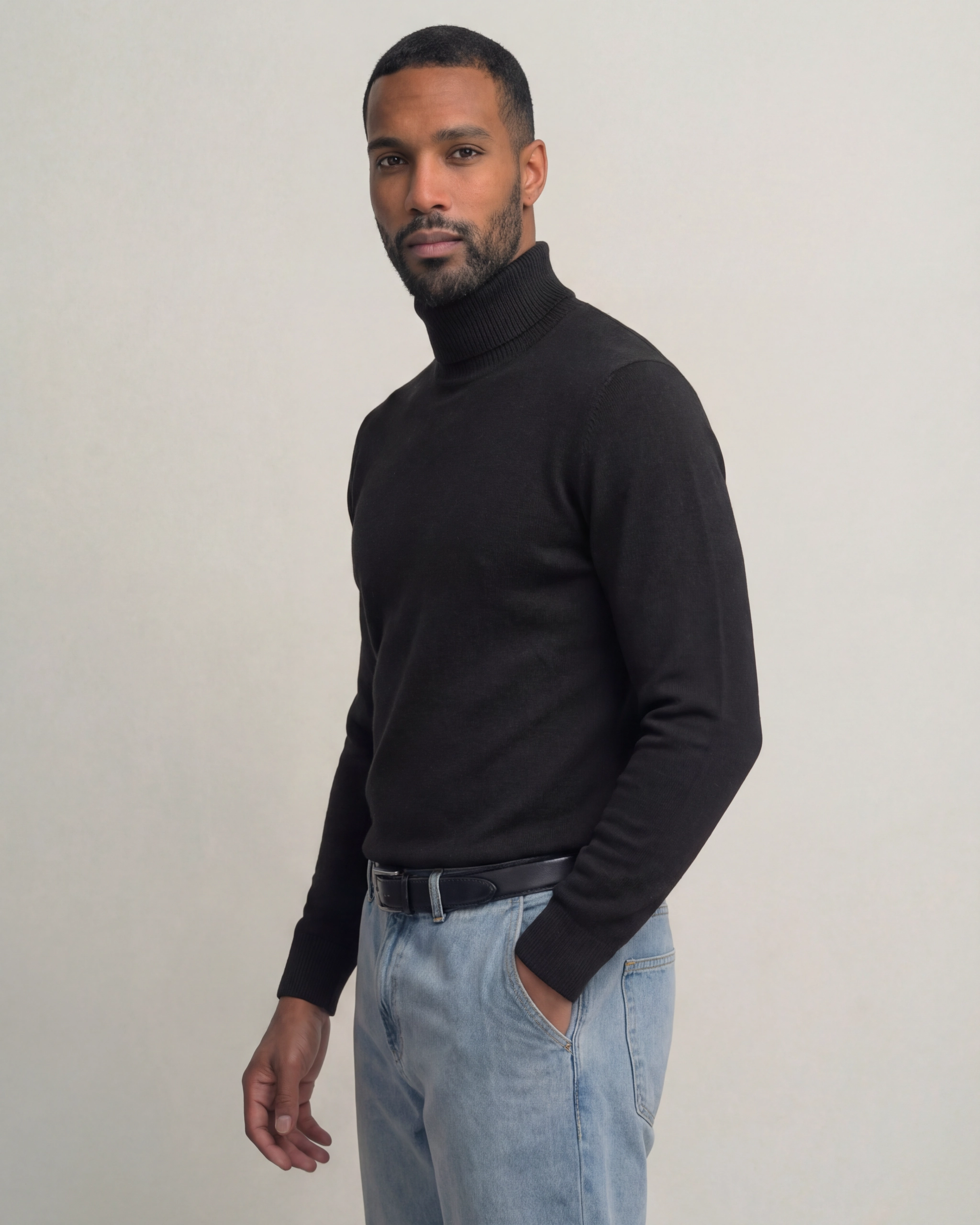Black Merino Wool Turtle-Neck er fremstillet af førsteklasses australsk 2/60 merinould. Denne Turtle-Neck har en strikketeknik på 14 gauge for en raffineret og behagelig pasform. Hvert stykke tøj laves på bestilling med en produktionstid på 3-5 uger. Merino Wool Turtle-Neck kombinerer tidløs stil med enestående håndværk til en alsidig garderobe.